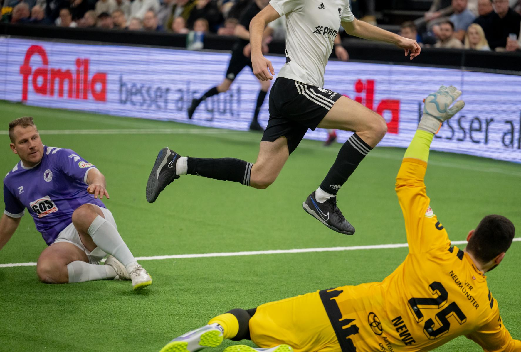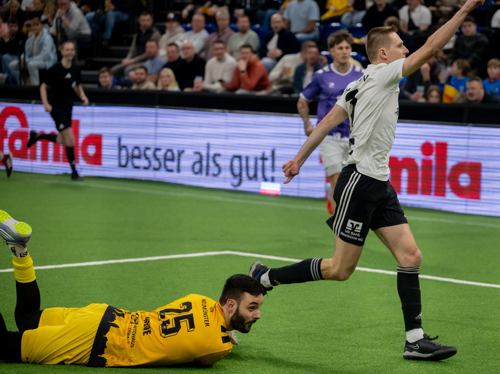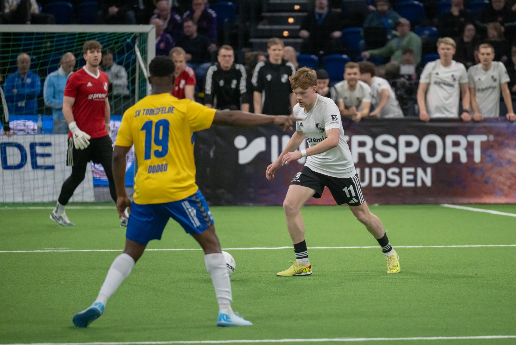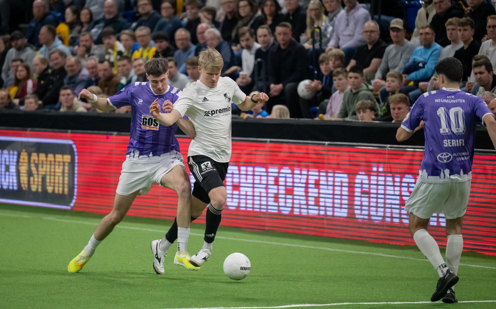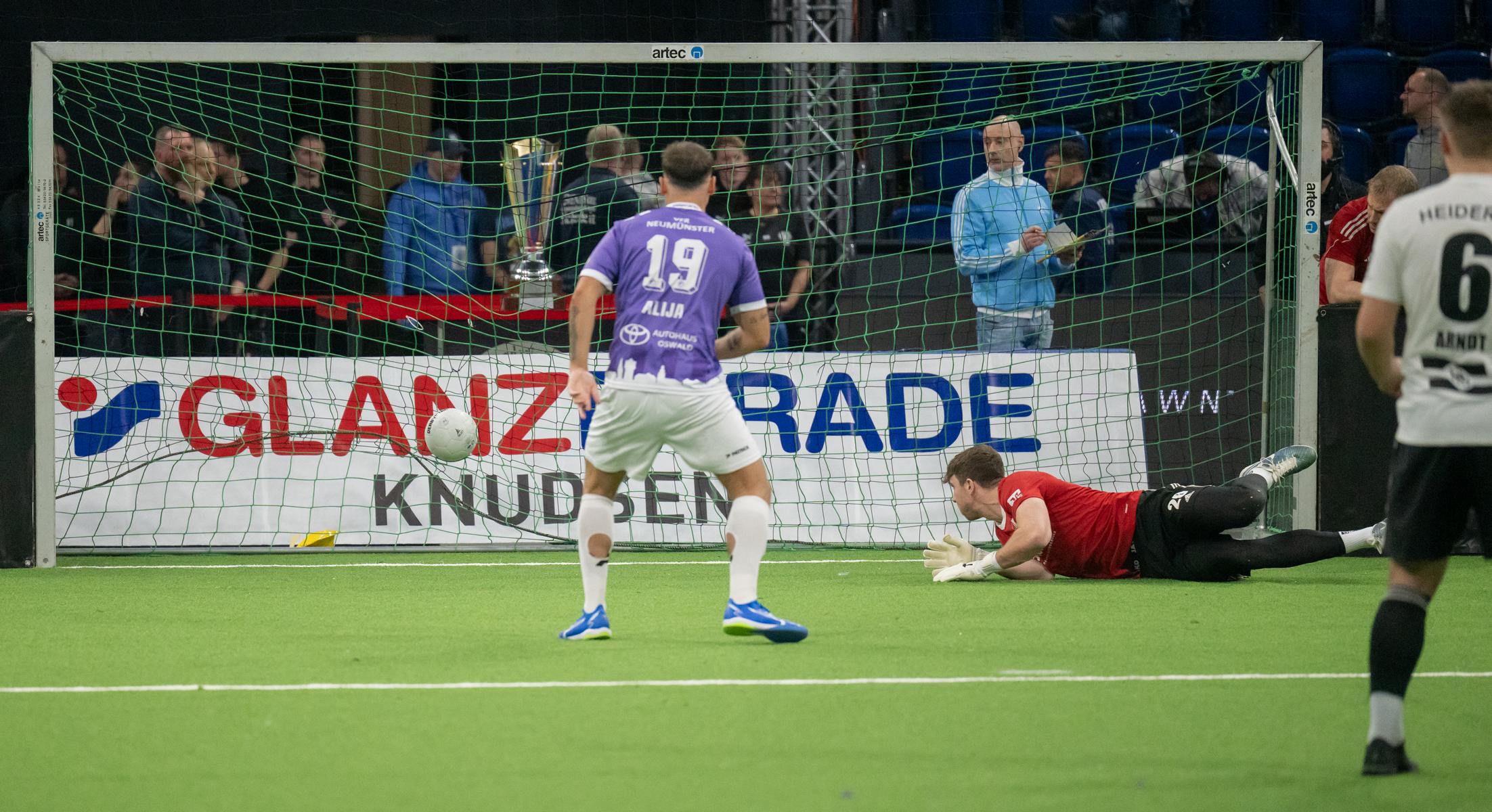 Im zweiten Gruppenspiel gegen den VfR Neumünster legten wir erneut stark los und führten schnell 2:0, Wolf und Gieseler trafen. Neumünster kam aber zurück und erkämpfte sich noch ein 2:2. Ein Spiel, das zeigte, wie eng die Duelle zwischen den beiden Oberligisten aktuell sind und wie schnell Partien in der Halle kippen können.